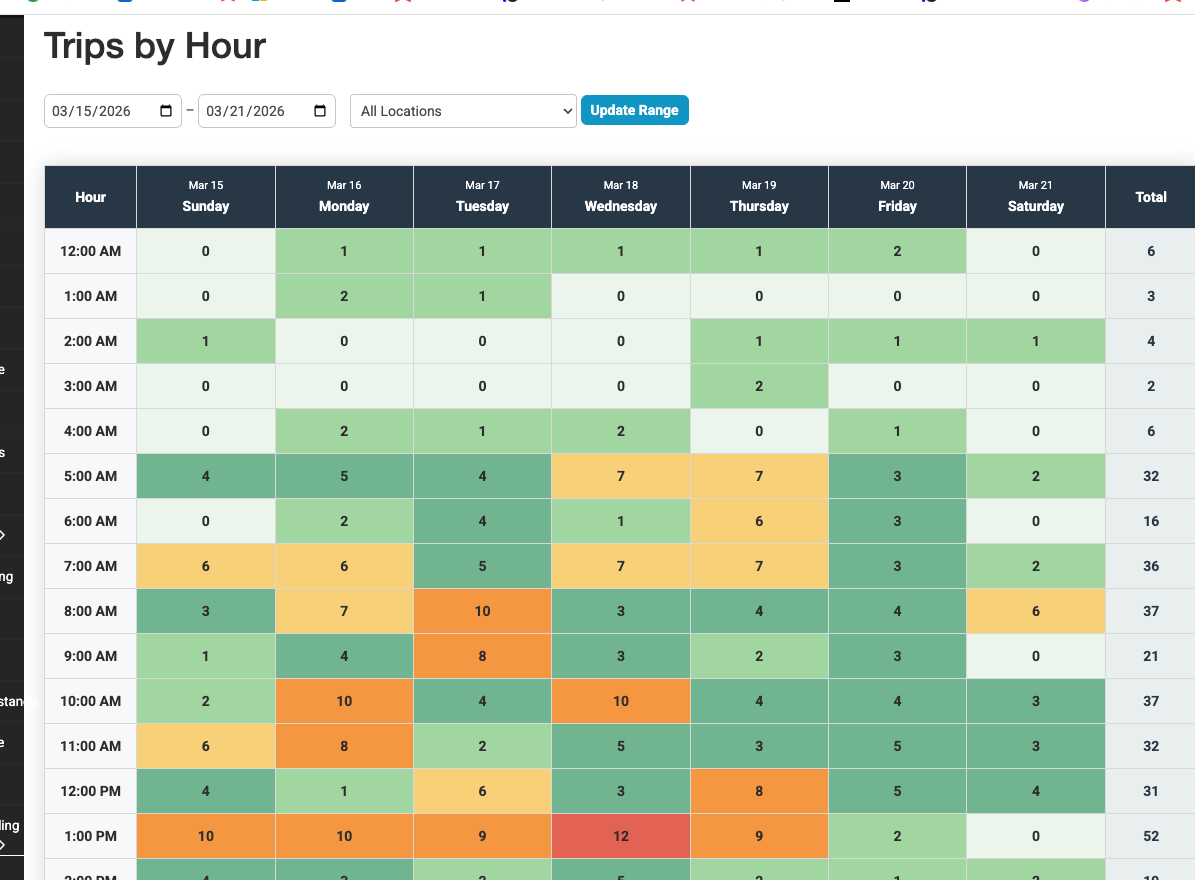 The Trips by Hour report shows you a heat map of your trip volume broken down by each hour of the day and each day of the week. It helps you quickly identify your busiest and slowest time slots so you can plan staffing, vehicle availability, and driver schedules more effectively.
