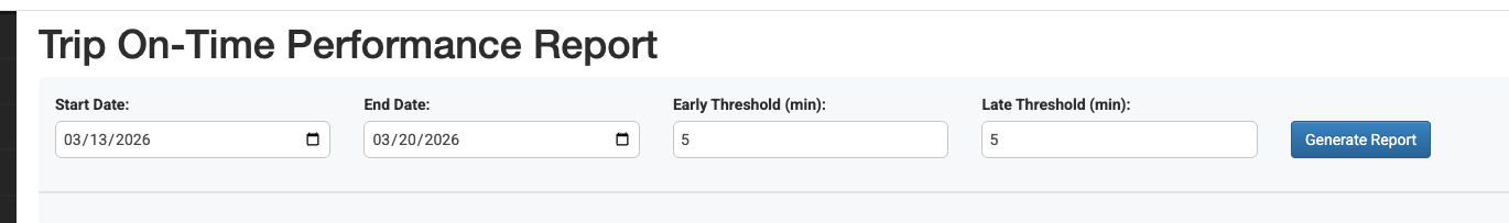 The Trip On-Time Performance Report helps you track how punctual your drivers are by comparing their actual arrival and pickup times against what was scheduled. This report is based on trip checkpoint data — not trip status changes — so it measures real-world timing at the pickup location.