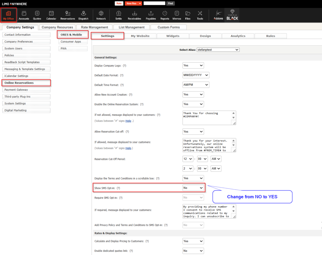 The SMS Opt-In Option can be found at My Office > Online Reservations > ORES & Mobile > Settings