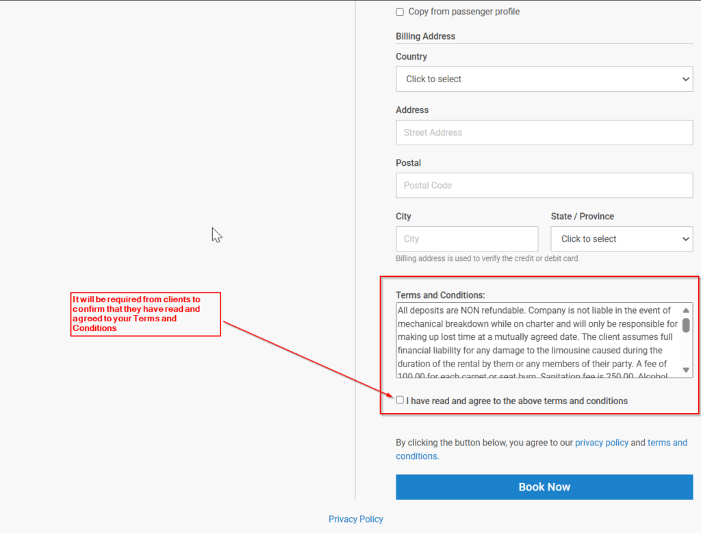 During the booking process, you have the ability to display Terms and Conditions requiring your clients to proactively accept said Terms and Conditions while entering their Card information and right before confirming their bookings.