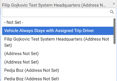 - From the vehicles section, you will see all your vehicles listed here. You’ll want to select the location where the vehicle lives. If your drivers take vehicles home at night, you can select “Always stays with Assigned Trip Driver”.