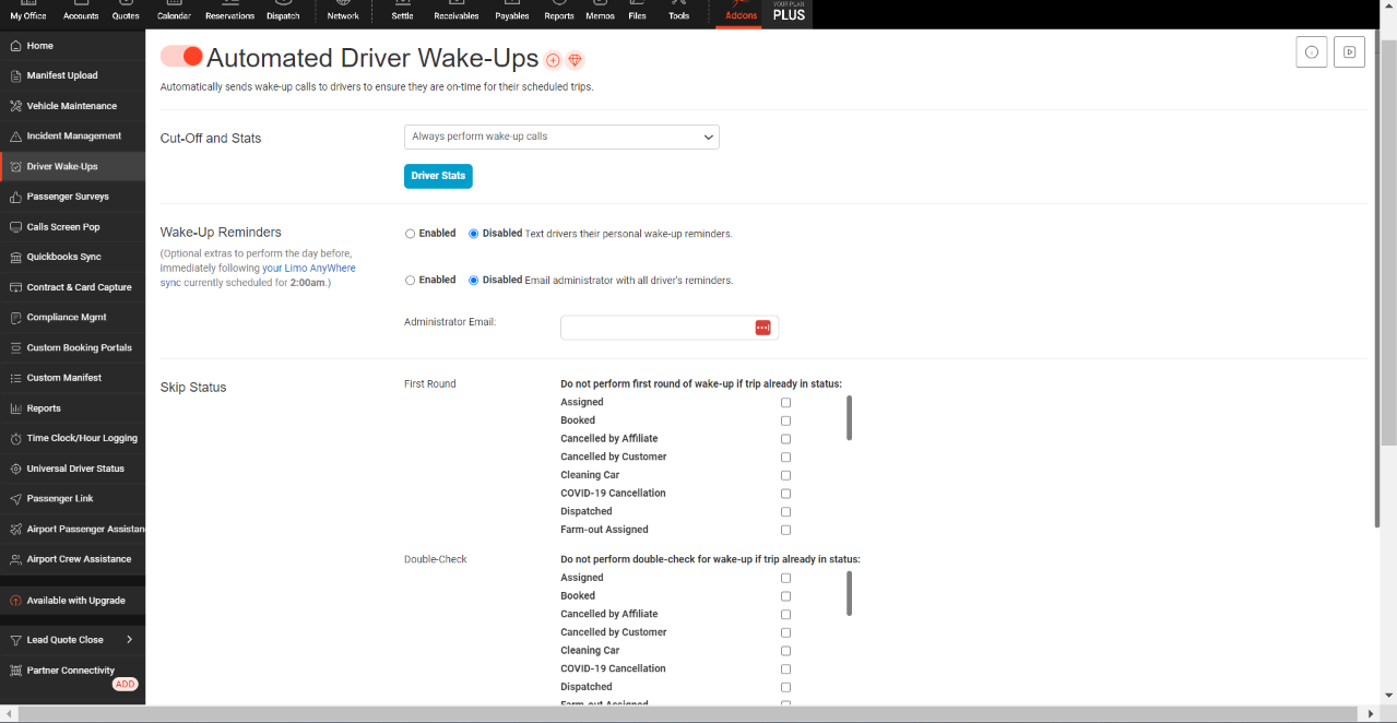 - The first section of Wake-Up Calls is Wake-Up Reminders. You can select to have your drivers texted with their personal wake up time, along with an email with all drivers wake up times. If you would like the email, just put your email in the empty field in here.