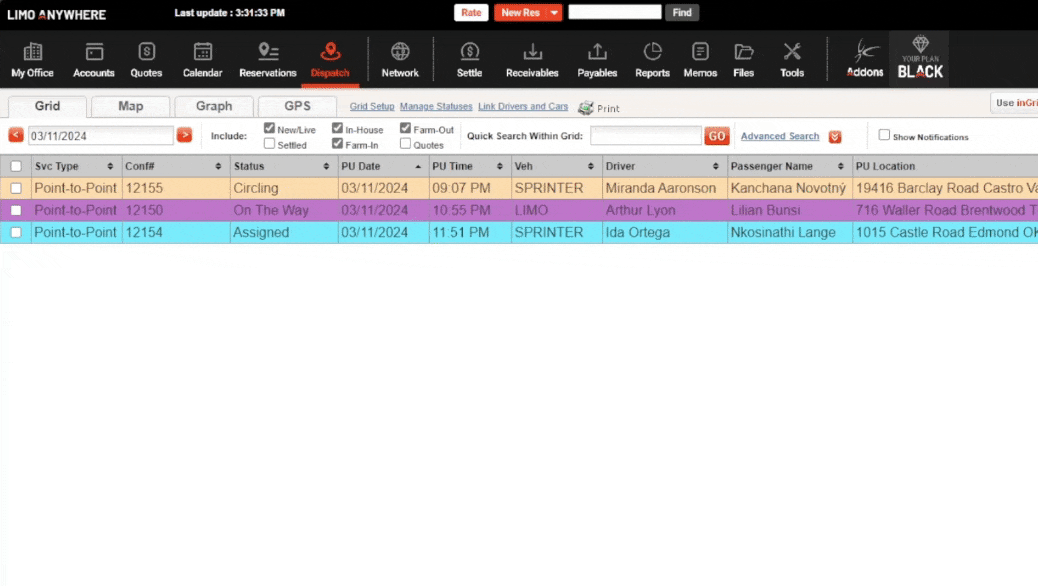 Instant Updates: The Dispatch Grid will automatically update to reflect any changes across the Limo Anywhere ecosystem in real time.