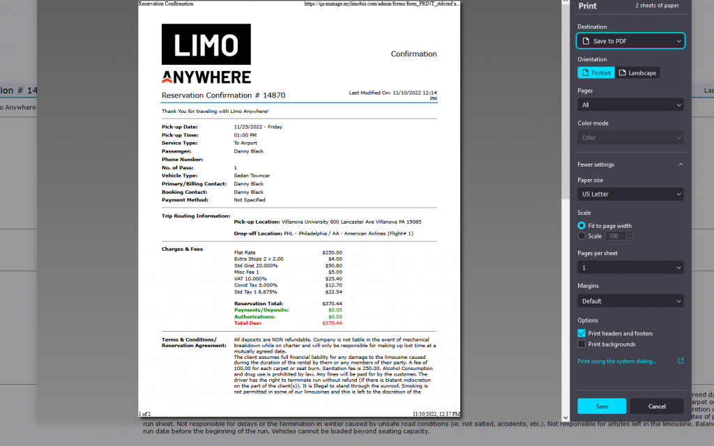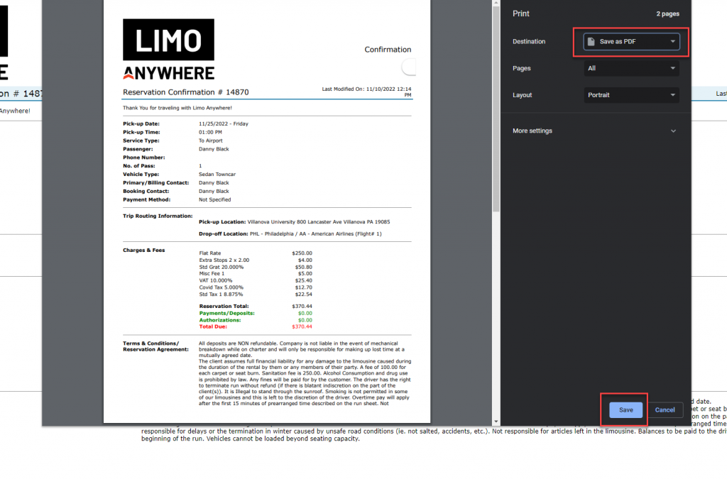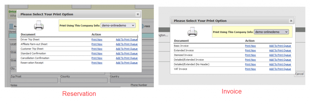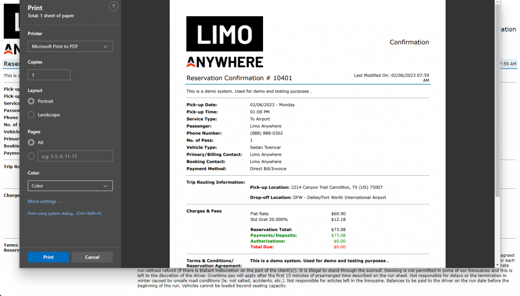 - Use “Print” in Limo Anywhere (Reservation, Invoice, etc.)