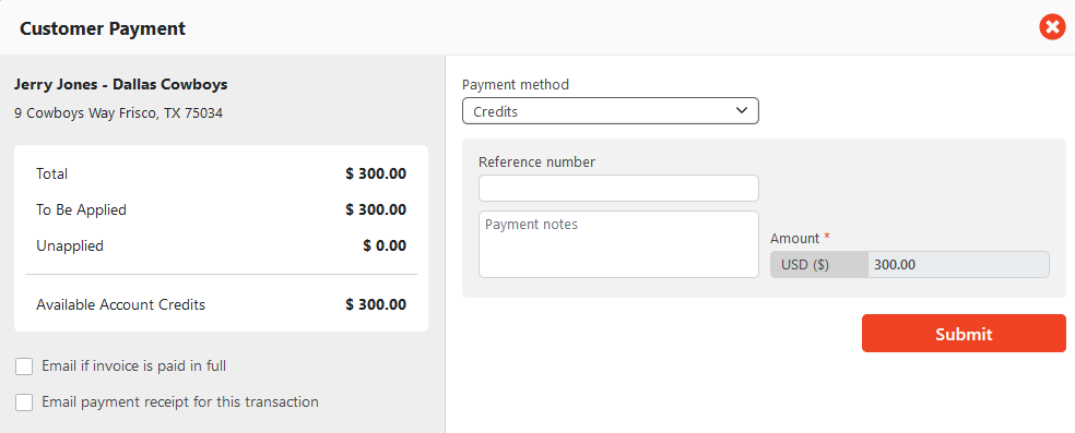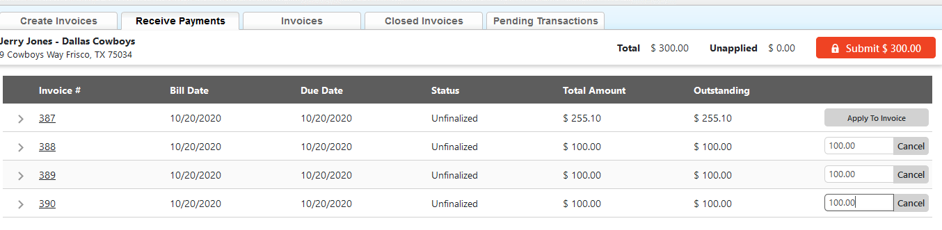 - Click Apply to Invoice to make the total equal to the set amount that was provided by the customer