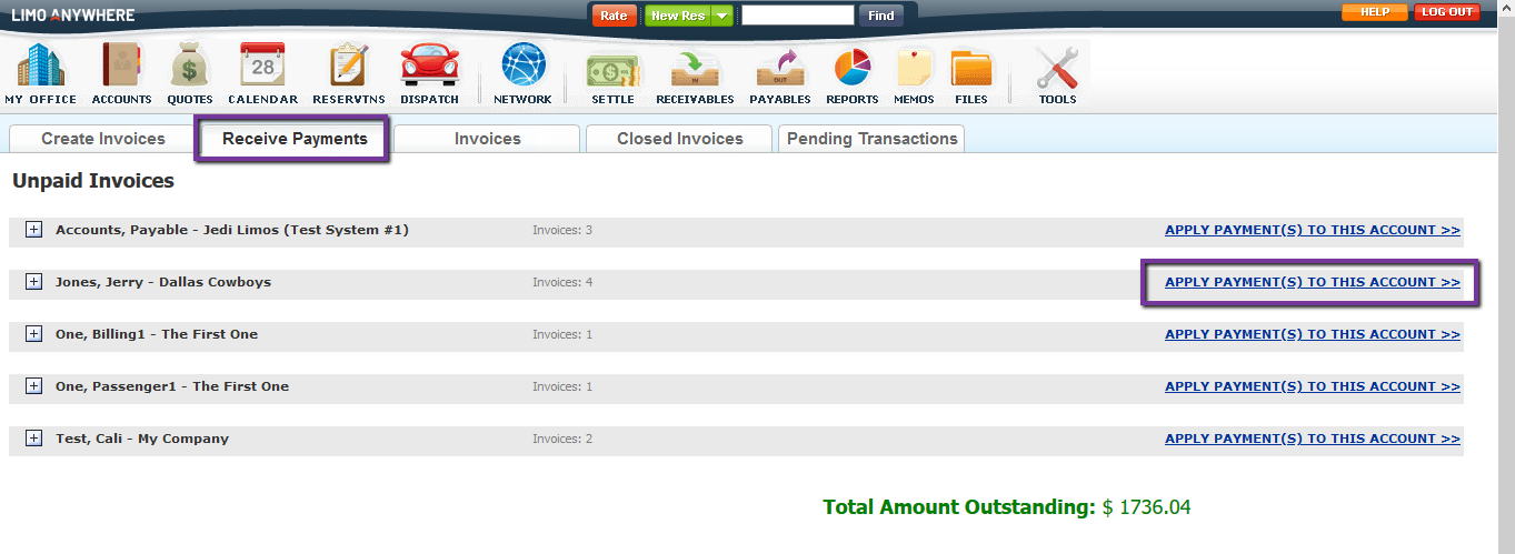 - Locate the desired Billing Contact name and click APPLY PAYMENT(S) TO THIS ACCOUNT