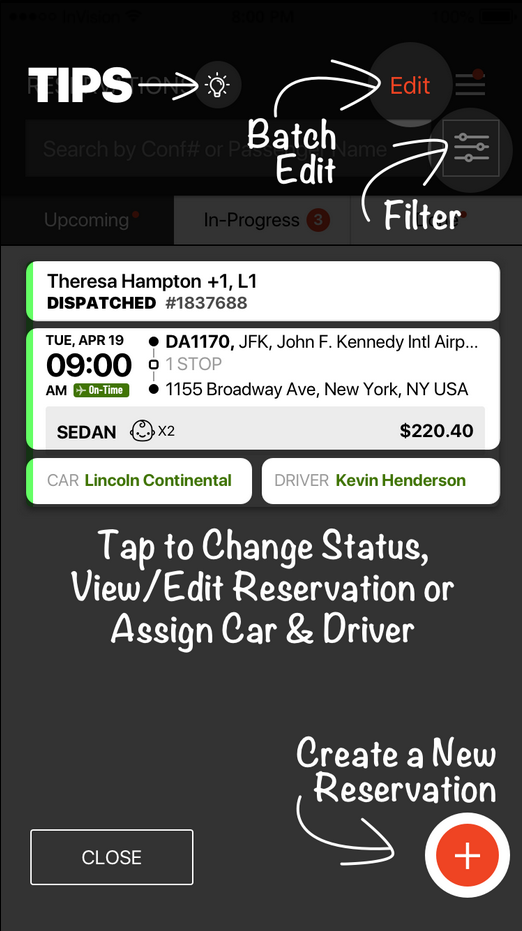 This overlay will pop-up the first time you log into Limo Anywhere Mobile and you can always access by tapping the light bulb at the top of the Reservations screen.