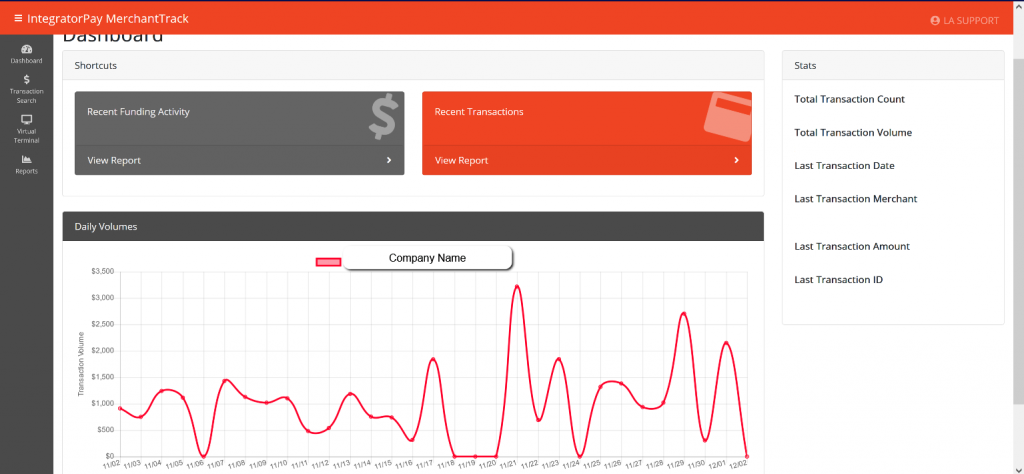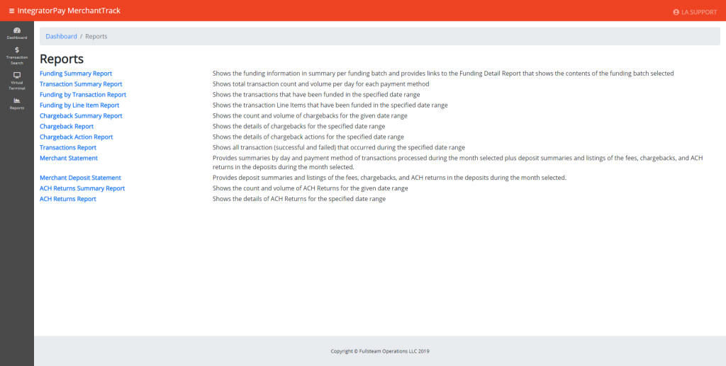- The Dashboard is the initial page that shows upon opening the LA Pay Reports area. On the left hand side of the page you will 4 options: Dashboard, Transaction Search, Virtual Terminal and Reports.