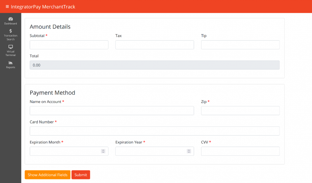 This option allows you to process a payment directly on the Merchant Track terminal. This will not be tied to any reservation or invoice within the Limo Anywhere system when ran here. You will need to place the total (taxes and tip fields are optional) All required fields are marked with a red asterisk (*).