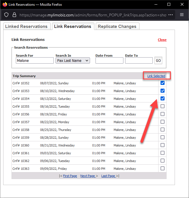 - Select the the reservation(s) you want to link by checking the box to the right of each reservation