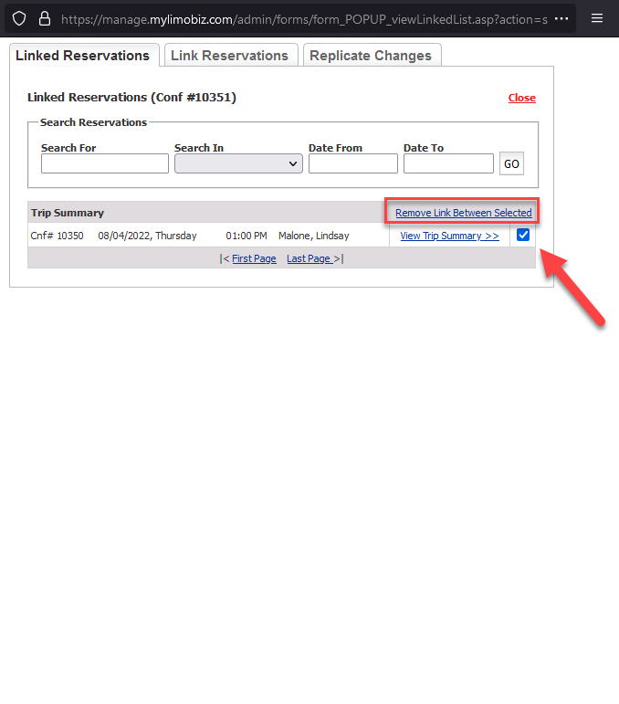 - Click ‘Remove Link Between Selected‘ to remove the link between the reservation(s)