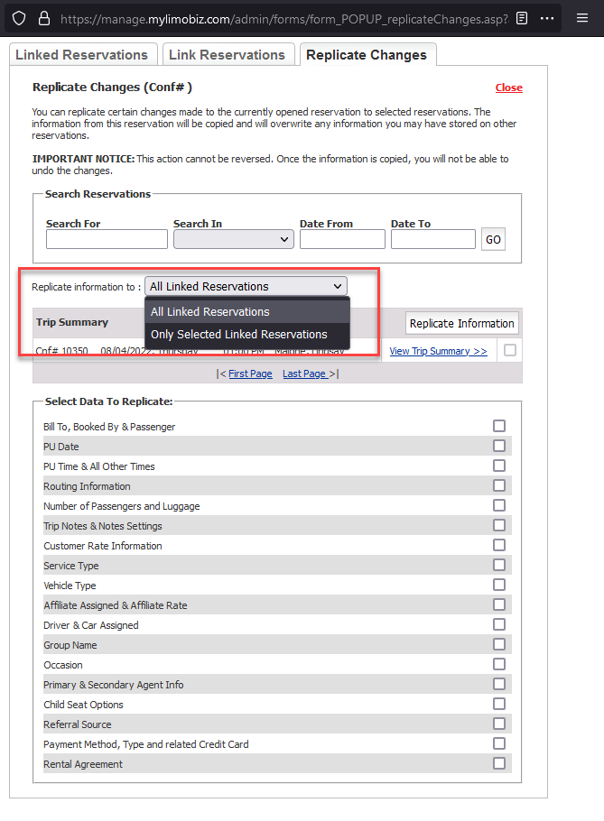 - Under ‘Replicate information to:‘ select ‘All Linked Reservations‘ to replicate to all or ‘Only Selected Linked Reservations‘ to replicate to only select reservations
