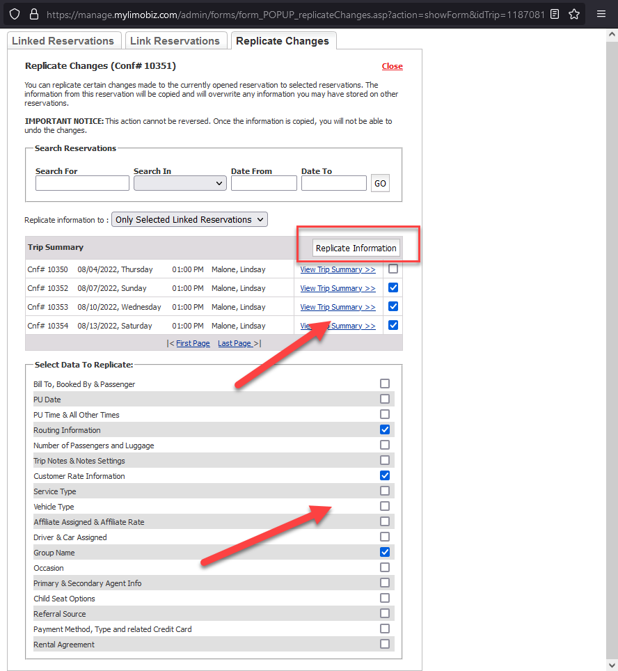- Click the ‘Replicate Information’ button to make the updates to the other reservations