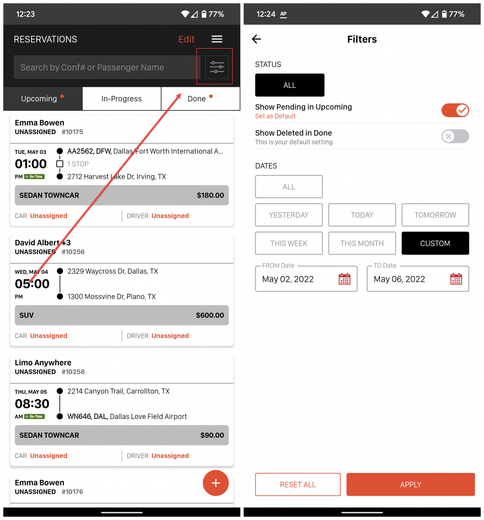- Tap on the ‘Filters‘ button in the top right of the Reservations screen