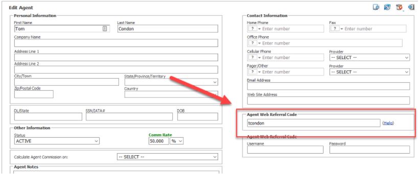 - Enter in a unique alphanumeric code into the ‘Agent Web Referral Code’. Note: This code must be unique for each Agent and not contain any special characters or spaces.