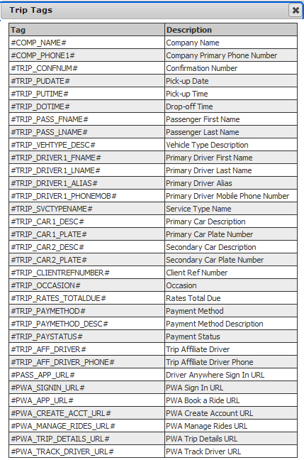 - This is the menu of available tags for trips on SMS