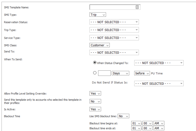 - The ‘Blackout Time’ setting allows you to set a time period where Scheduled SMS will not be sent. For example: You have a 12 hour reminder to send 12 hours before PU Time and a customer’s PU Time is 1 PM (13:00). You can set up the blackout time period that includes 1 AM (01:00) and that reminder will not be sent out during that time. Note: Messages not sent during blackout time will never be sent out.