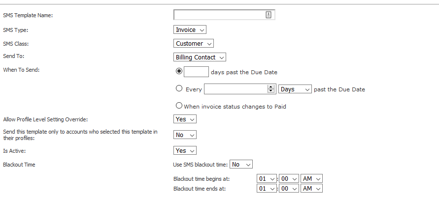 - ‘Use SMS Blackout Time’: ‘Yes’ or ‘No’.