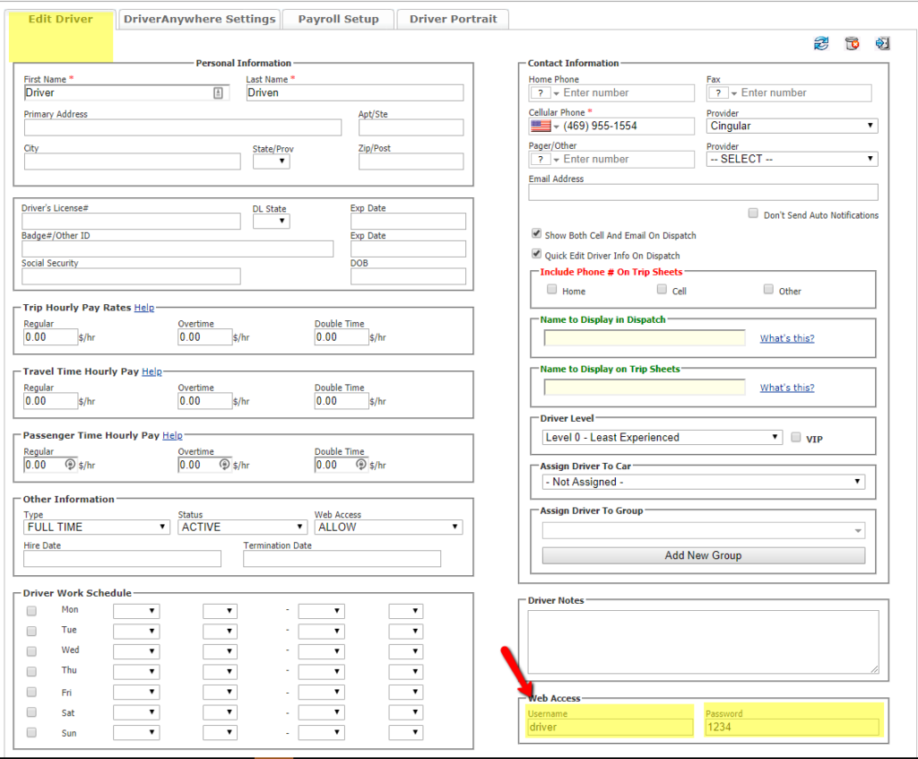 - Under the ‘Edit Driver‘ tab on the bottom right you will see ‘Web Access‘. Below that you will see fields for Username and Password.