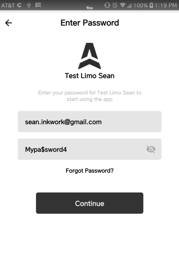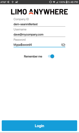When logging in to Limo Anywhere Mobile you will use the same Username and Password that you use to log in to the Limo Anywhere System.