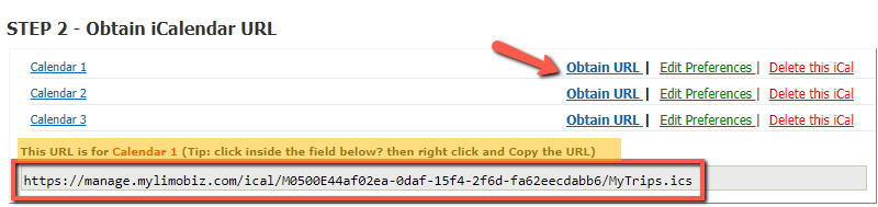 - Click Obtain URL to display the URL for that iCalendar in the window below