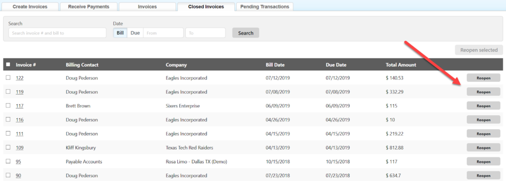 Additionally, you can reopen an invoice from the Closed Invoices tab in the Receivables section by clicking on the ‘Reopen‘ button for that invoice.