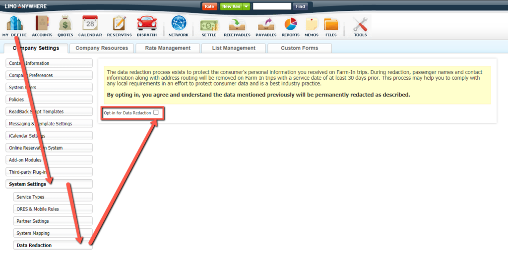 In some markets it is necessary to protect passenger information on trips that you receive from affiliates. This information includes passenger names and contact information along with address routing details. If you Opt-in for Data Redaction this information will be removed from Farm In trips 30 days after the pick up.
