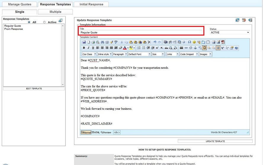Note: Detailed instructions are available below the ‘Add Template’ button. There is also an Example in that section that may be used. Another example of text that can be used is listed below:Dear #CUST_NAME#,Thank you for considering #COMPANY# for your transportation needs.This quote is for the service described below:#QUOTE_SUMMARY#The rate for the above service will be:#PRICE_QUOTE#If you have any questions regarding this quote please contact #COMPANY# at #PHONE#; or email us at #EMAIL#. You can also #WEB_ADDRESS#.We look forward to earning your business.#COMPANY##RATE_DISCLAIMER# - Click the ‘Add Template‘ button to save the entry and create the Quote Response Template.