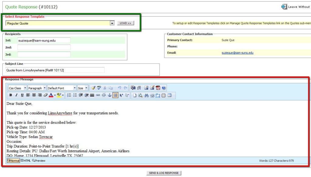Note: If you do not have any ‘Response Templates’, go to ‘Quotes’ icon in the toolbar, click on ‘Response Templates’ tab and scroll down for instructions ‘How to set up Quote Response Templates”. - Scroll down through the information loaded into the template to verify that it is correct. Make any changes needed to the ‘Response Message’ (highlighted in red).