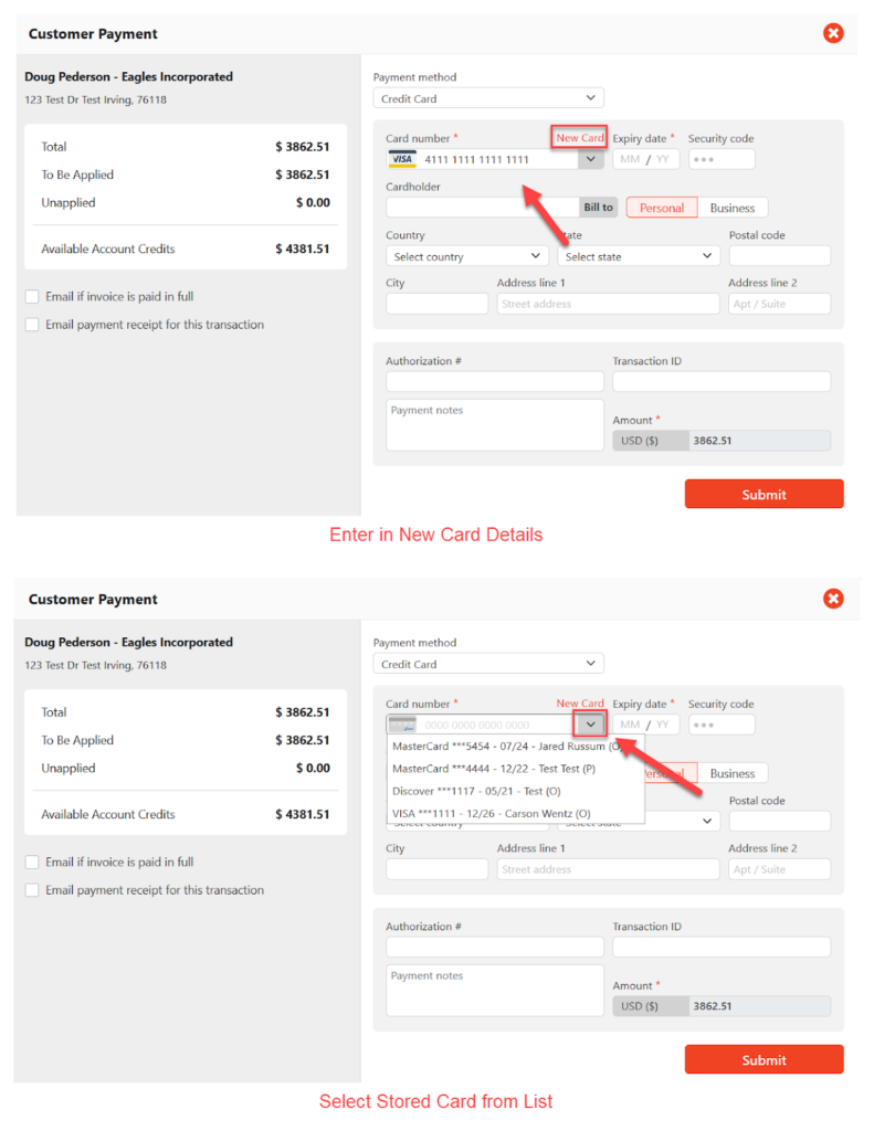 b. Enter in Credit Card details or choose the Stored Credit Card from list