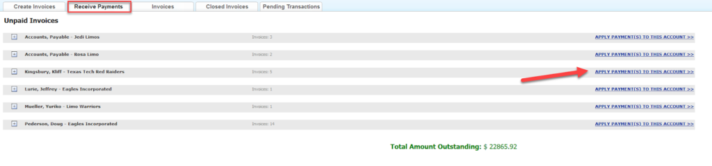 3. Click ‘Apply Payment(s) To This Account >>‘ link for the Billing Contact you are wanting to receive payment for.