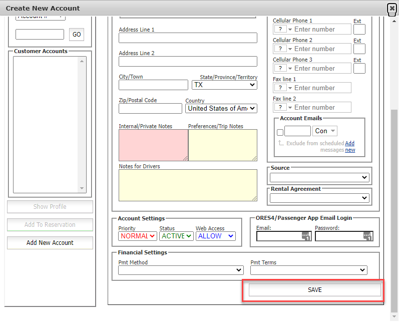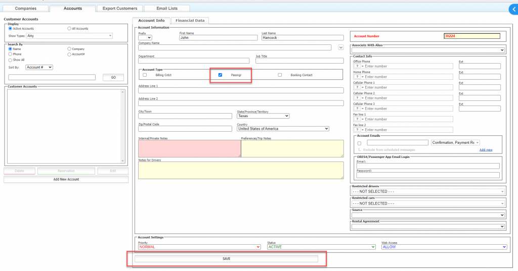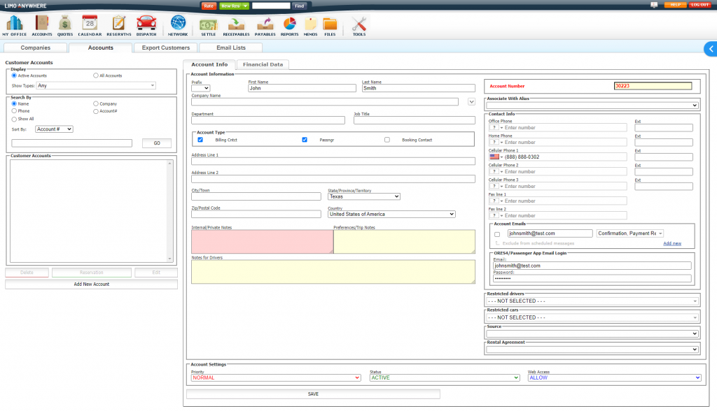 Passenger Priority: Normal (default), VIP, or VVIPStatus: Active or Inactive in Limo AnywhereWeb Access: Allow or Disallow - (OPTIONAL STEP) Enter the Phone Numbers associated with this account.