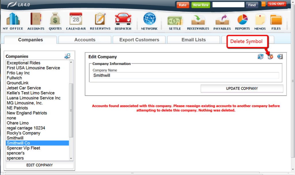 Note:If the company that is to be deleted is assigned to any accounts the message above in red will appear and the company will not be deleted. It would be required to remove the company from any accounts before deleting it.