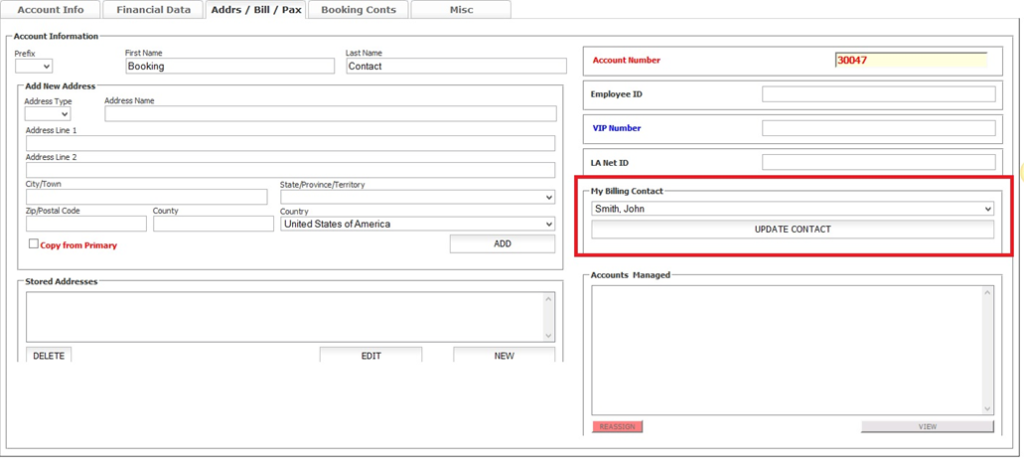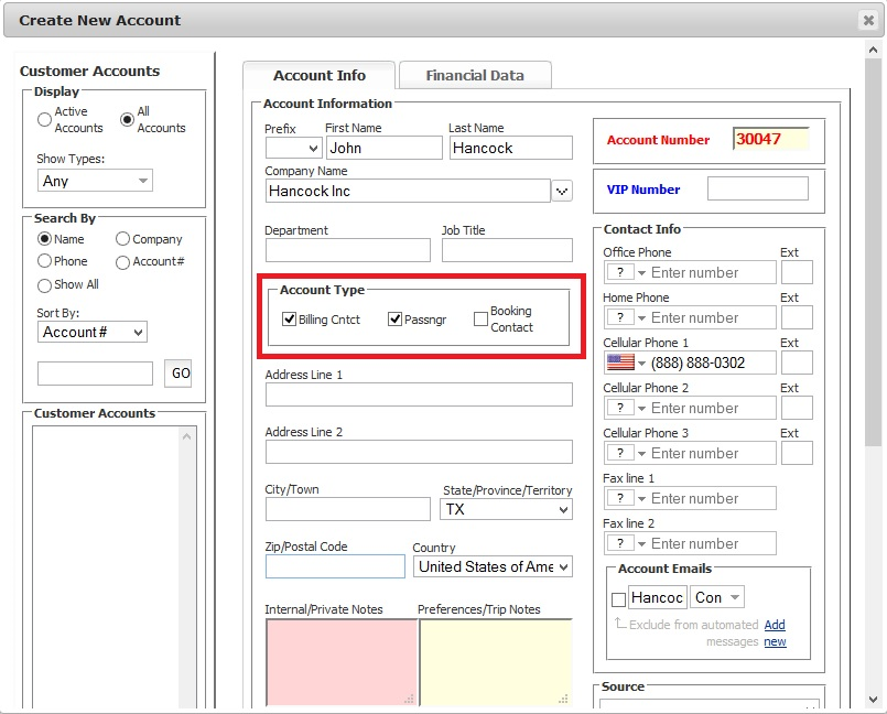 - Select the Account Type:Billing ContactPassengerBooking Contact