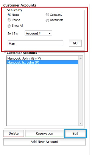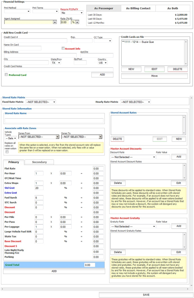 Credit card numbers that are added to a reservation that contains an account will automatically be saved in this section. You can also add/edit credit card numbers here so that they will show up in the stored credit card list for the account on the reservation.