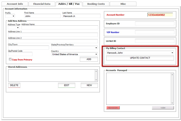 | Name of the Addrs/Bill/Pax | The ‘Prefix’, ‘First Name’, ‘Last Name’, and ‘Account Number’ will populate from the Account Info tab. |