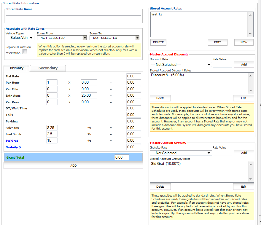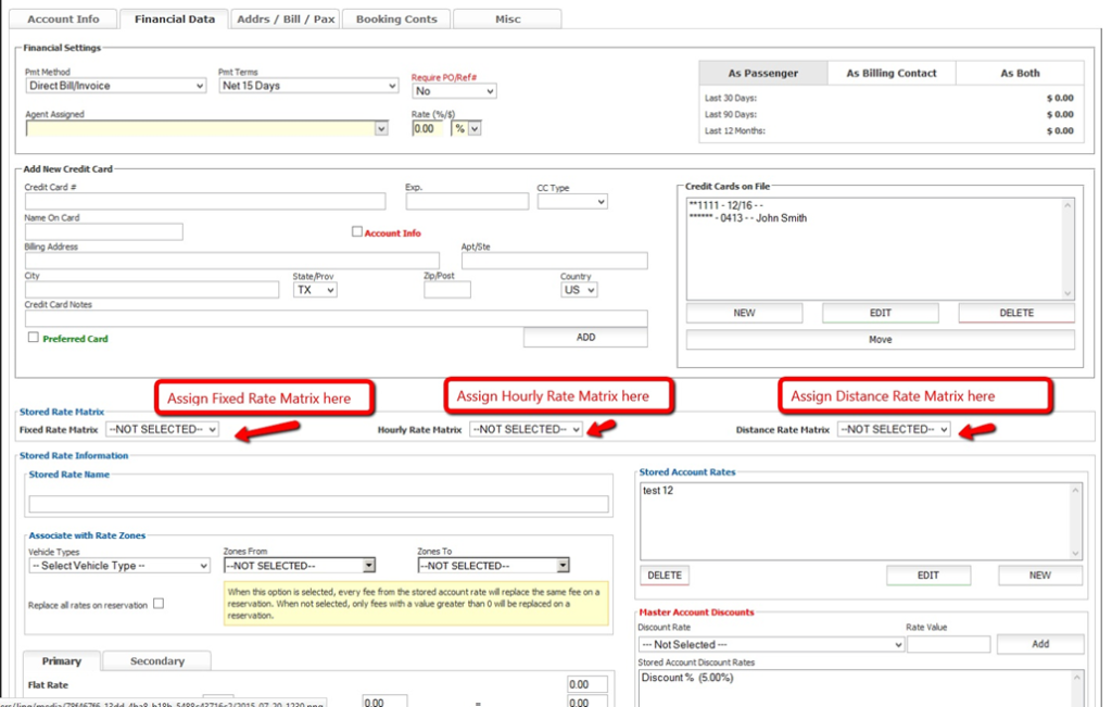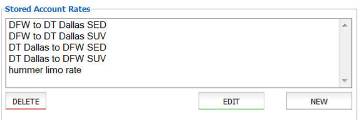 Stored Account Rates can be set up as either Base Rates that are either per hour, per passenger, per unit, or per mile for a given Vehicle Type; or Flat Rates(Fixed Rates or Point to Point Rates). Below each rate will be illustrated.