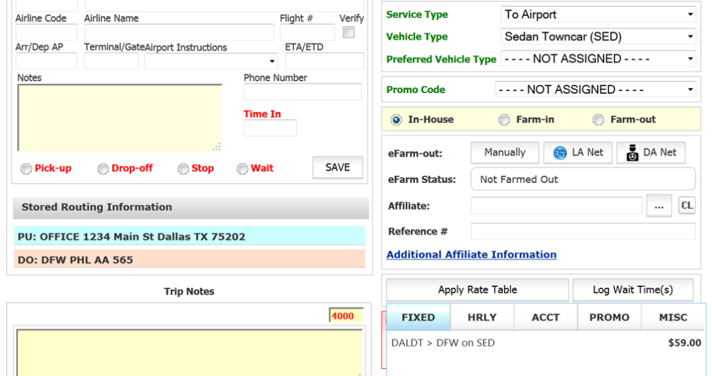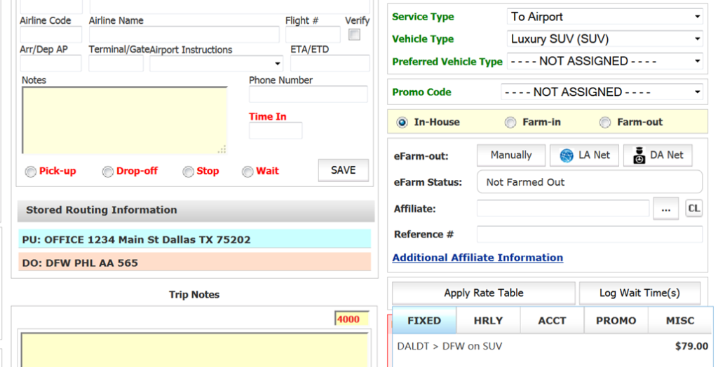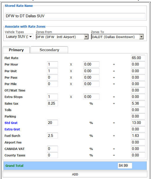 - Enter a Flat Rate. In this example a rate of $65.00 per trip form DFW zone to Dallas DT zone in Vehicle Type Luxury SUV is entered.