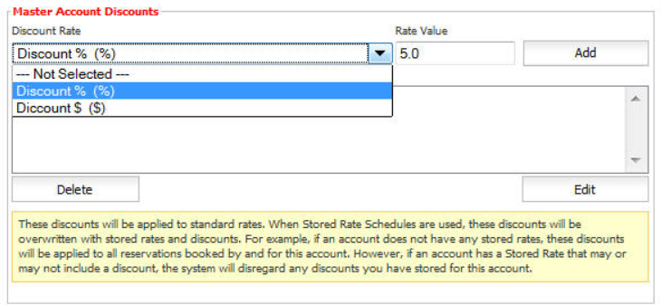 - Multiple Master Stored Discounts can be applied to a single account. However all will be applied in every reservation so it is best to decide on one discount to be used for the account.