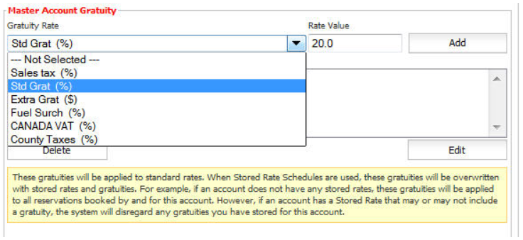 - Select the Gratuity Rate that will be used from the drop down list. The rates are established in System Rate Manager. See the Knowledge Base article Using System Rate Manager for additional details.