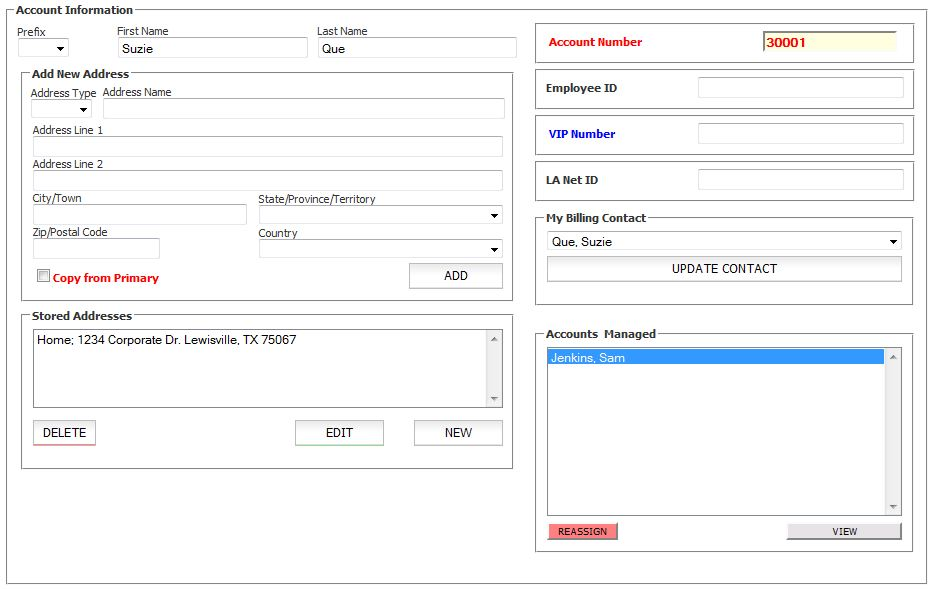 - Create the ‘Passenger Account‘ (DO NOT Select ‘Billing Cntct‘) by filling out the required fields in the ‘Account Info‘ section.