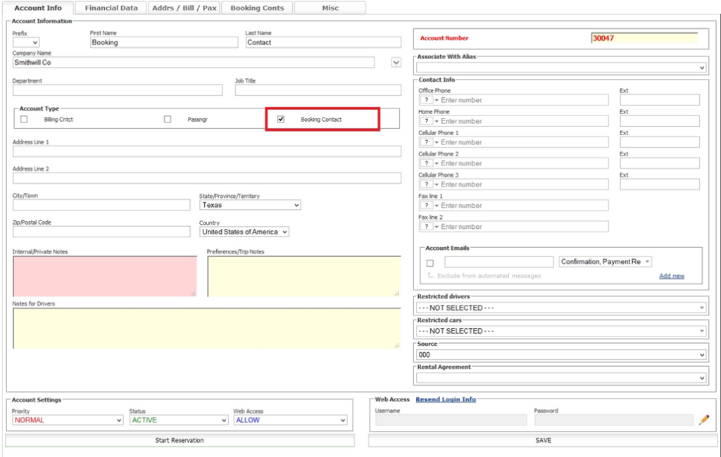 Booking Contacts are accounts as well. They are people that do not necessarily use the limousine service, but they make reservations for others. An Executive Assistant that makes reservations for his/her boss, or a Travel Manager that makes reservations for a staff are some examples of possible booking contacts.