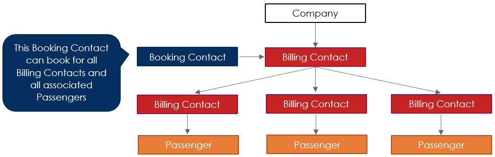 If each Billing Contact was to have one or more dedicated Booking Contacts, the structure would likely be similar to the below visual representation.