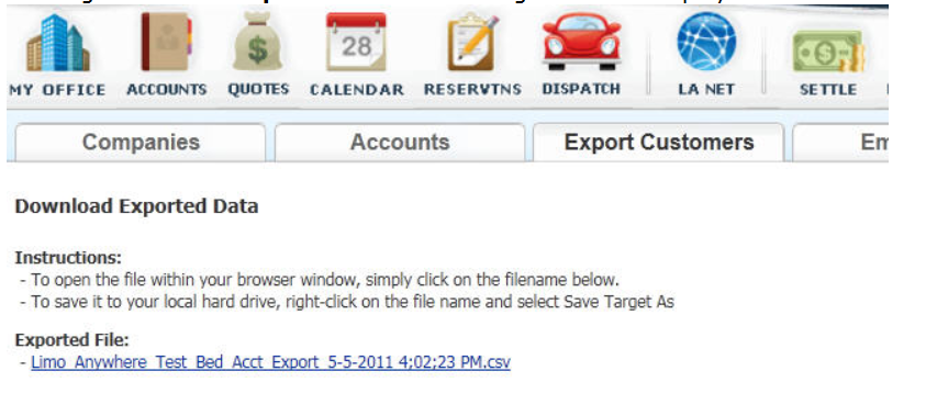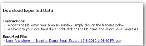 Exporting Customer Data out of Limo Anywhere allows the creation of files that can be used to facilitate marketing efforts, import into other programs such as an email utility, or create helpful back up files that can be used should internet service be interrupted.
