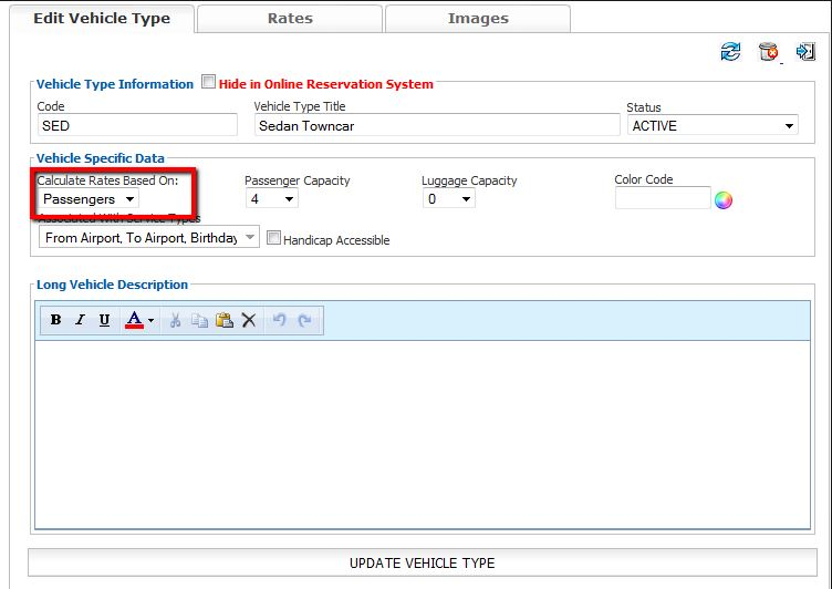- The Vehicle Type will display in the ‘Edit Vehicle Type‘ section. Ensure that the setting ‘Calculate Rates Based On:‘ is set to Passenger as illustrated below.