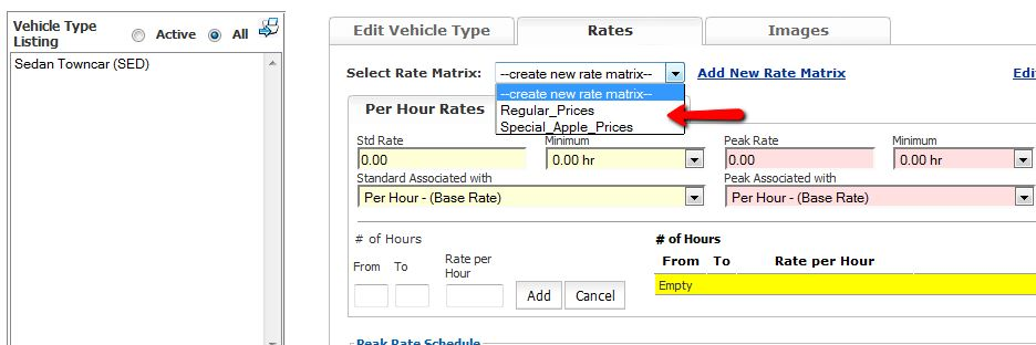 - Select the rate matrix you would like to changes the hourly prices on from the ‘Select Rate Matrix:‘ drop down box as illustrated below.
