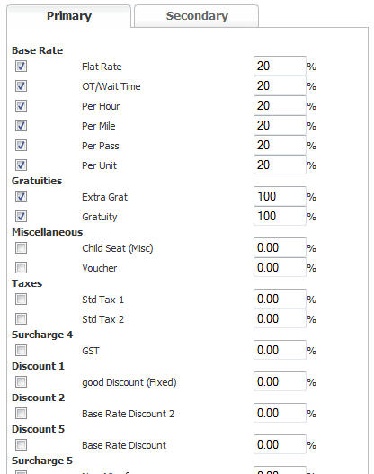- If you are paying your driver a percentage of the fees / charges enter the amounts here. Check the box next to the applicable rate and enter the percent that the driver is to be paid from each element of the total fee you charge your customer. In the example below the driver is being paid 20% of the elements that go into building the Base Rate, 100% of the Gratuity amounts, and 0% of any fees.