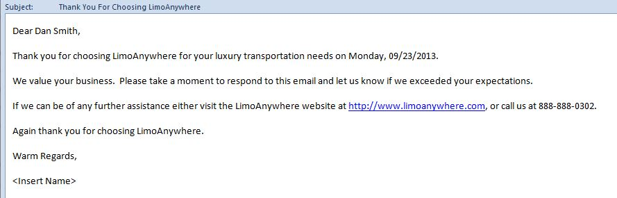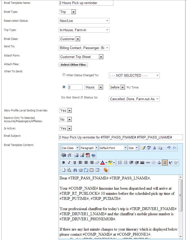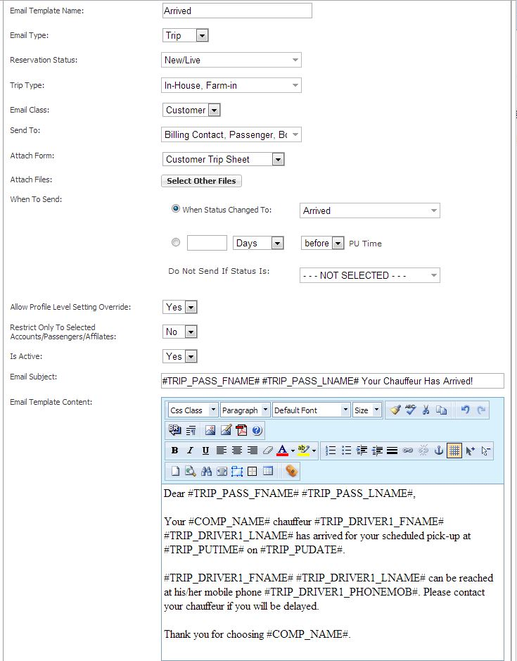 Scheduled Email Module allows the creation of dynamically formatted email templates that can be scheduled to be sent to customers, drivers, and/or affiliates based on criteria in the reservation or invoice. Great examples of Scheduled Emails are 24 hour trip reminders, 30 day past due invoice reminders, and automated emails when statuses are set.