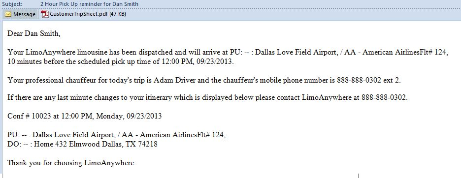Your #COMP_NAME# limousine has been dispatched and will arrive at #TRIP_RT_PUBLOCK# 10 minutes before the scheduled pick up time of #TRIP_PUTIME#, #TRIP_PUDATE#.