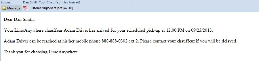 Your #COMP_NAME# chauffeur #TRIP_DRIVER1_FNAME# #TRIP_DRIVER1_LNAME# has arrived for your scheduled pick-up at #TRIP_PUTIME# on #TRIP_PUDATE#.